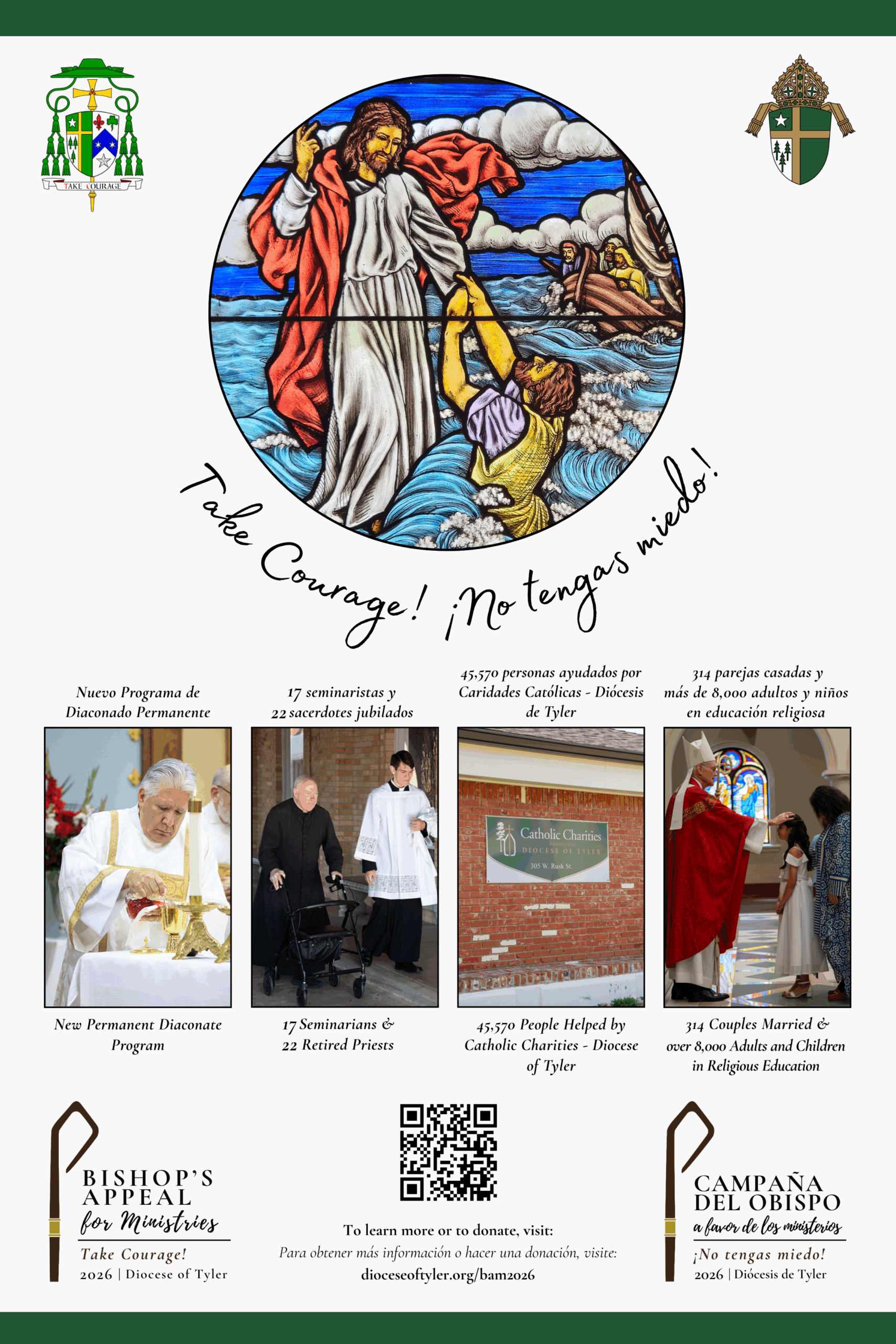 The 2026 Bishop’s Appeal has been renamed: Bishop’s Appeal for Ministries (BAM). The new name emphasizes the focus of the appeal on providing support for the essential ministries that serve the faithful of the diocese. This year’s theme: Take Courage, Bishop Kelly’s episcopal motto, invites us to embrace God’s mercy and allow that mercy to fill us with the strength and courage needed to respond wholeheartedly to the Lord’s call. It is a call to healing and transformation, enabling us to go out to others with the healing love of Jesus Christ, to give as a gift to others the gift that we have received from God.