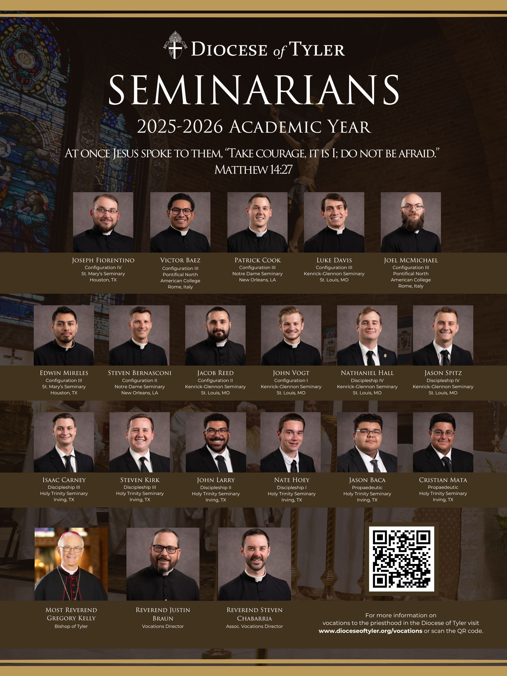 - Have some familiarity with the Diocese of Tyler and the people with whom the candidate feels called to serve here as a future priest, i.e. by living (past or present), working or studying within the diocese. (On a case-by-case basis, consideration will be given to those who do not meet this criterion only after they have seriously considered the possibility of serving in their home diocese with the consultation of their home Bishop and/or Vocation Director.)